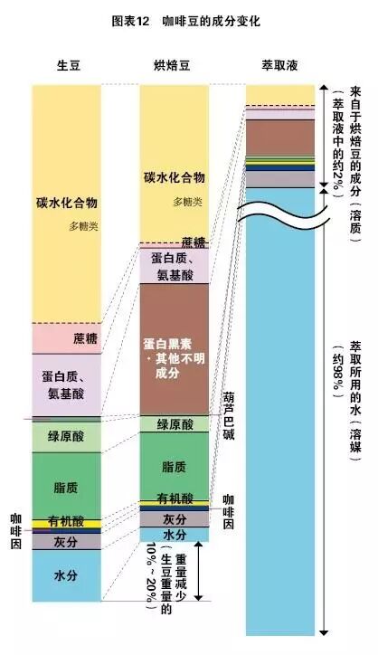 通過該圖表我們能夠知道生豆原有成分是如何變化的。同時也發現苦味與來自咖啡因等成分的綠原酸、香味和酸味與蔗糖具有密切關係。沒必要搞清楚為什麼會這樣,知道有這種現象即可。對生豆進行烘焙、萃取之後,成分的增減狀態能夠在頭腦中產生一定的形象就足夠了。