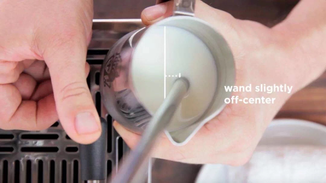 第二位置:是指蒸汽頭在液面的位置,我們可以把牛奶的液面看成是一個鐘錶,以我們的正前方為12點,無論蒸汽棒是哪個角度,接觸液面最容易產生旋轉的位置一定不是中間點,也不會是12點和6點位置,最容易旋轉的點是3點和9點鐘位置,所以最佳位置就是右側3點或者左側9點位置。