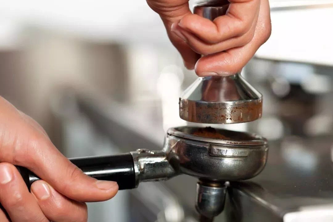 咖啡粉分佈均勻後,用粉錘把它壓平了就可以啦,記住壓粉的時候,一定要確保手柄是水平的,並且粉錘是向垂直下方用力的。在市面上,有許多咖啡機配備的手柄,粉碗和把手並不是水平的,因此需要找到一個角度,在壓粉的時候能保證創造一個完美的向下的力。