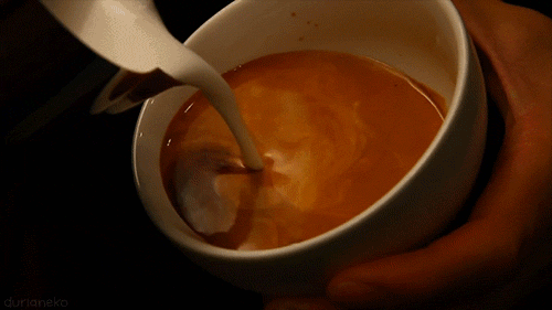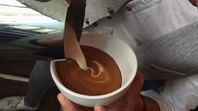 可以想像一下,將牛奶從奶缸中倒入咖啡杯中與濃縮液進行融合,就像有人從跳板上跳下,跳入水池。當然,你一定不想在落入的同時,立刻掀起一波翻湧的白色浪潮,淹蓋住咖啡油脂的棕色畫布,所以第一件事是要讓一部分打發好的牛奶在濃縮咖啡下面形成一層基礎層,將油脂層托起,然後再用奶泡打破濃縮咖啡的油脂層,在咖啡的表面製作拉花圖案。