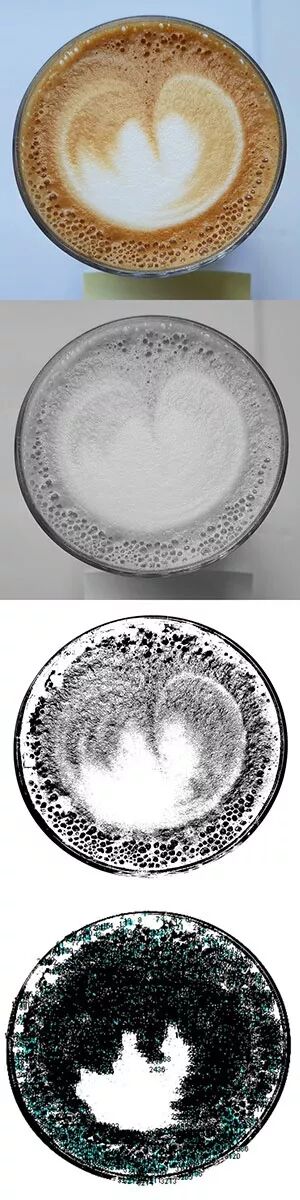 我們對氣泡的形成很感興趣,所以我給每杯咖啡拍了一系列照片,然後用圖像分析軟件對它們進行處理。這樣,我就可以在給定的尺寸範圍內計數和測量圓形的特徵(見圖1)。這些較大氣泡所覆蓋的表面積,相對於杯子的總表面積,成為衡量“起泡程度”的一個指標。