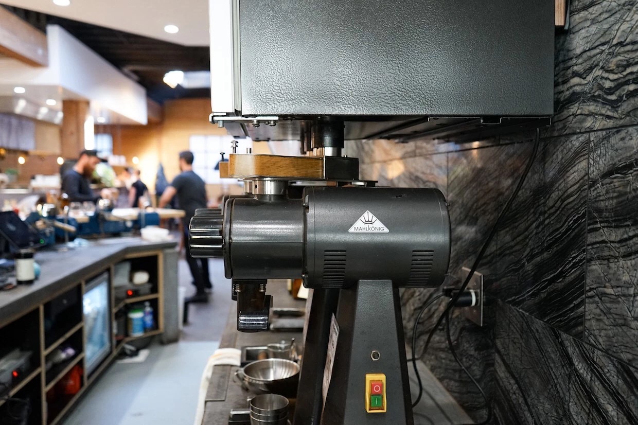 如圖所示,Proud Mary在牆上安裝了一台冰箱,將三台EK43的豆倉安放在裡面,通過冰箱底部穿孔與分量器相連,由此達到冷凍研磨的效果。