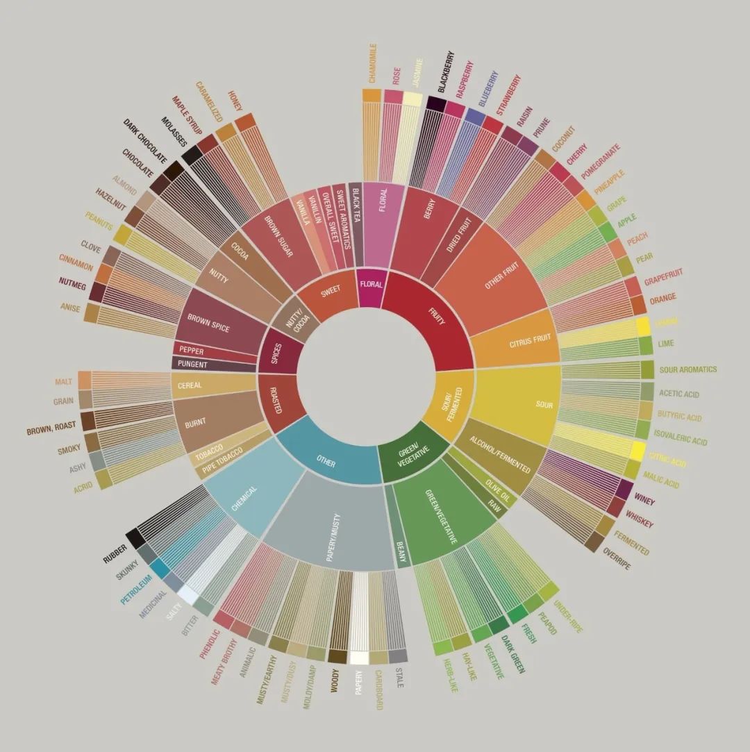 強烈建議此焙度地圖可參考Ted Lingle 最舊版的咖啡風味輪,從嗅覺香氣的那半張風味輪從上半輪到下半輪中,也一併顯示出淺焙到深焙在氣味上的變化。依照這三張最重要的地圖,我們便可以有計畫地去規劃出一個學習品飲的路徑:一次盡量只改動一個變數的品飲練習。