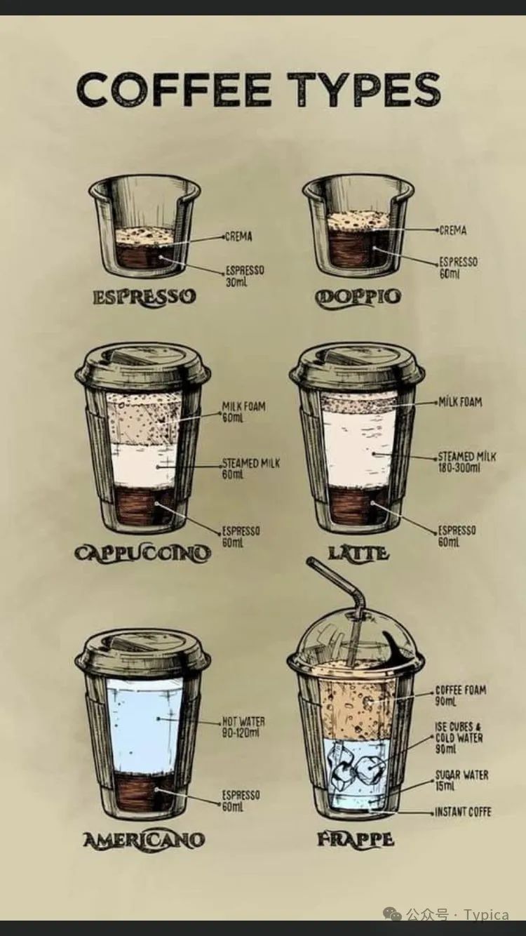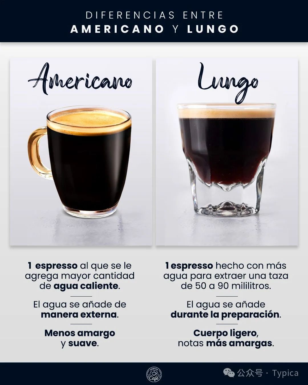 相較之下,美式咖啡Americano是在萃取濃縮咖啡Espresso後加入熱水製成的,所以它們並不相同。通常由 1 盎司(30 毫升)的濃縮咖啡與約 2 盎司(60 毫升)的熱水混合而成: