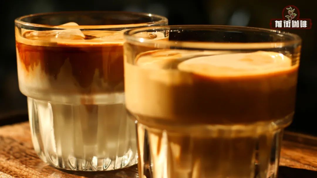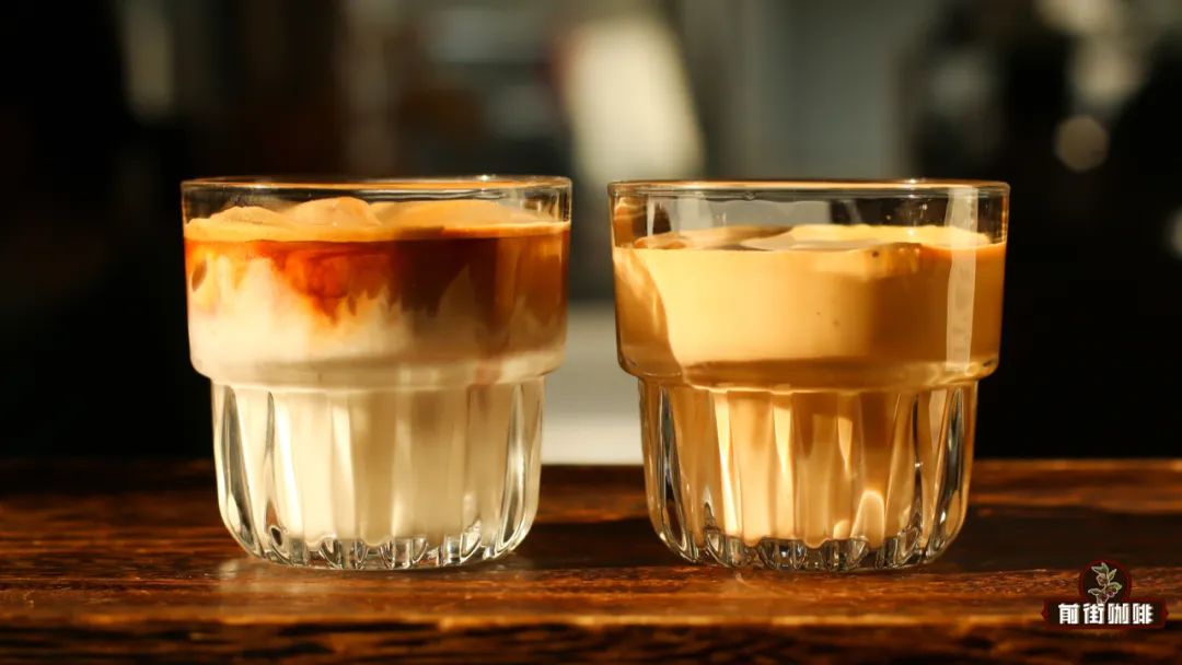 而先倒牛奶/水後倒濃縮的順序則會讓大部分的濃縮咖啡浮在上層,在沒有攪拌的情況下,一口下去我們會最先喝到咖啡液,隨後才是其他的材料。分層的情況會根據傾倒時的力和其他材料的密度而定,分層越明顯,那麼每口下去都會有著不一樣的體驗。因為融合度不高,所以每口喝到的比例都有所不同。