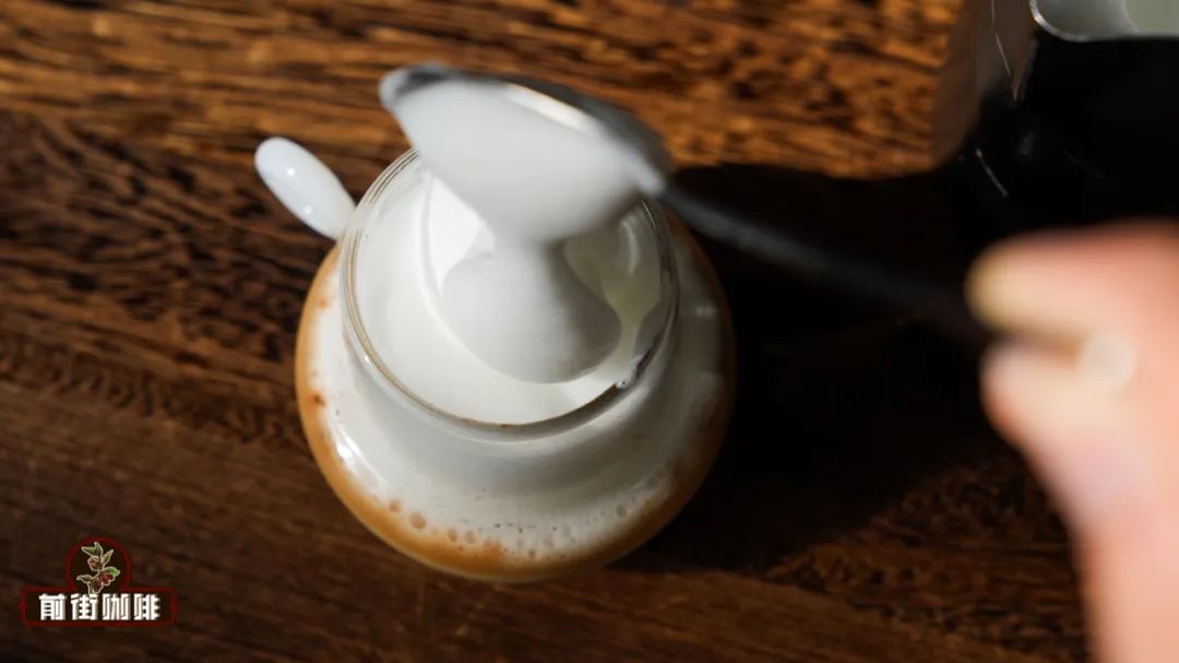 緊接著我們拿出剛剛打發好的牛奶奶泡,用小湯匙將奶泡挖出來,覆蓋在濃縮咖啡上,直到滿杯。(千萬不要用太大的杯子,不然等下一口下去都喝不到咖啡)