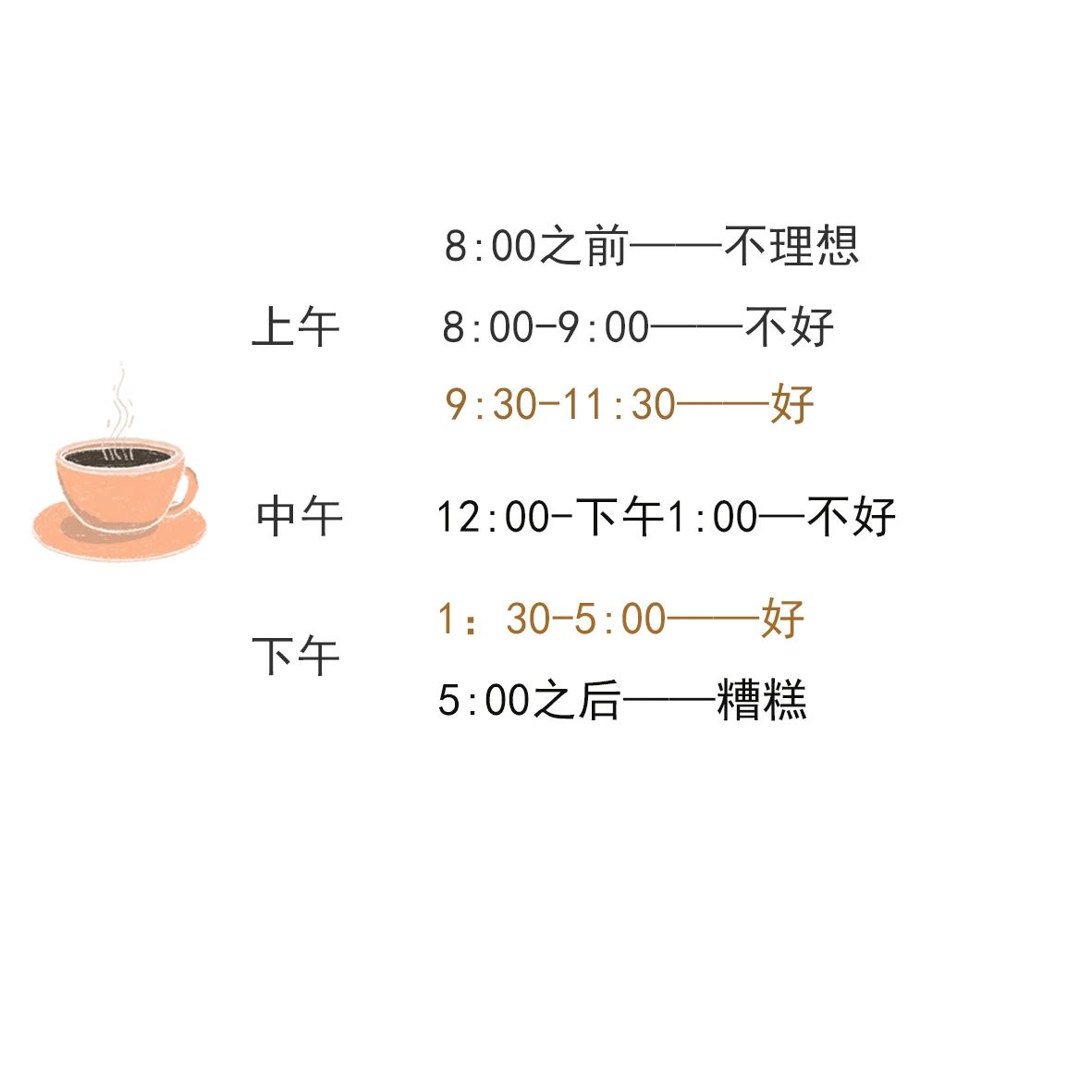 由於早晨起床後皮質醇水平開始升高,所以不建議起床後就喝咖啡;如果您要等到午餐才開始喝第一杯咖啡,那麼也會限制了咖啡的有效性;下午喝咖啡,咖啡因會在您的系統中停留長達12個小時,並有可能導致失眠,巨大的壓力和健康危害。