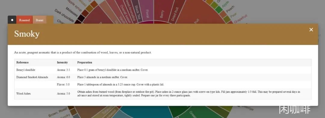 根據SCAA(美國精品咖啡協會)的咖啡風味輪描述,「煙感」風味歸屬於「烘焙」類別,通常與深烘焙咖啡相關,並可能伴隨其他風味,如烘焙、焦糖或菸草味 [4]。
